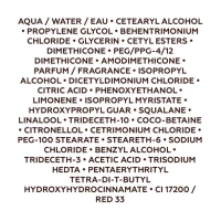 Aqua / Water / Eau, Cetearyl Alcohol, Behentrimonium Chloride, Cetyl Esters, Glycerin, Hydroxyethylcellulose, Isopropyl Alcohol, Panthenol, Hydrolyzed Rice Protein, Hydrolyzed Soy Protein, Citric Acid, Sodium Benzoate, Benzyl Alcohol, Parfum / Fragrance, Limonene, Linalool, Hexyl Cinnamal, Coumarin.